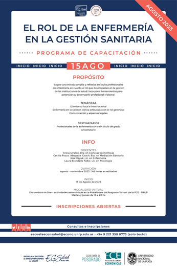 Está abierta la inscripción para el Programa de Capacitación «El rol de la enfermería en la Gestión Sanitaria», organizado por la Escuela de Gestión de Organizaciones de Salud de la Secretaría de Posgrado de la Facultad de Ciencias Económicas de la Universidad Nacional de La Plata y destinado a profesionales de la enfermería con o sin título de grado universitario.